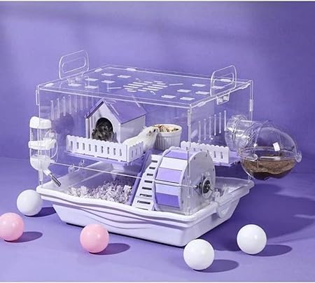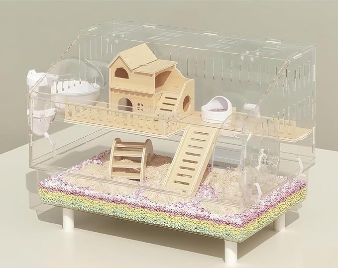 Ruexueのハムスターケージは、ハムスターに広々とした生活空間を提供する二階建て設計のケージです。全面透明な素材を使用しているため、どの角度からもハムスターの様子を観察可能です。