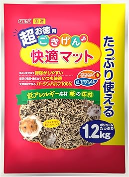 「超お徳用ごきげん快適マット」は、低アレルギー素材を採用した紙製の床材です。粉塵が出にくいよう加工されており、呼吸器への負担に配慮したい場合にも取り入れやすい特徴があります。細かい紙片が広がりやすいため、ハムスターが巣材を運ぶ動作を妨げにくく、冬場に必要な寝床作りを助ける素材です。量が多く、ケージの底全体に厚みを出しやすいため、冷えが気になる時期の環境づくりに活用しやすい床材といえます。